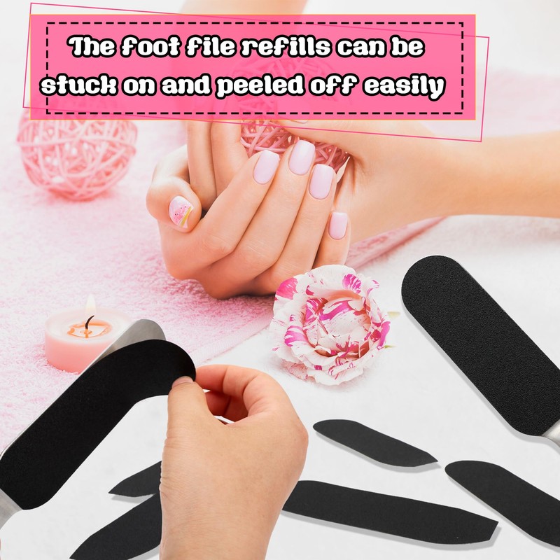 - 【Easy to Use】: The foot file refills can be stuck on and peeled off easily, simple to apply for most people, nice workmanship, and water-resistant adhesive keeps refill strips in place during use, ideal for smoothing dry, calloused, cracked heels and feet