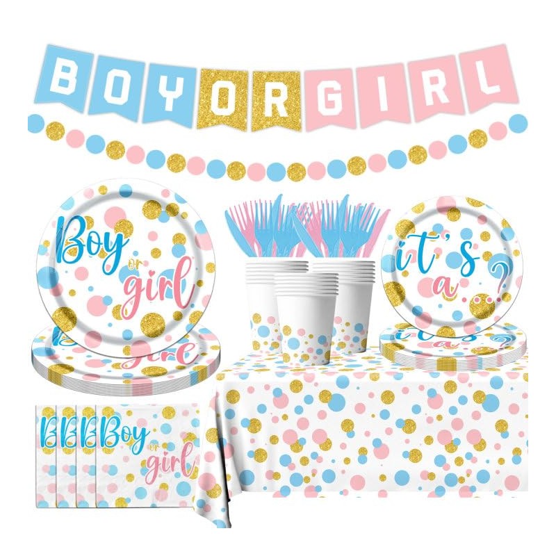 - Gender Reveal Decorations Kit: These Gender Reveal party napkins and plates decorated with white base background, pink, blue and gold dots elements and“Boy or Girl”words printing are the perfect Gender Reveal party decorations and a great way to create inspirational table decorations with friends and family. Decorating your Gender Reveal with these tableware kit can make your party full of the festival atmosphere