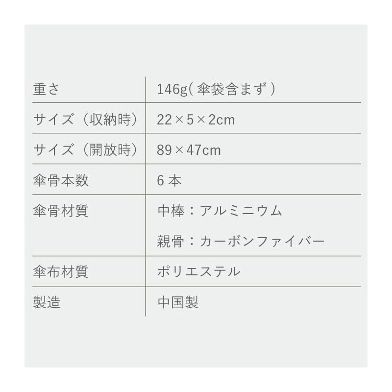 - 収納時 22cm x 5cm x 2cm 開放時89x 47cm 骨6本 グラスファイバー フラットパネルタイプの折りたたみ傘 146g