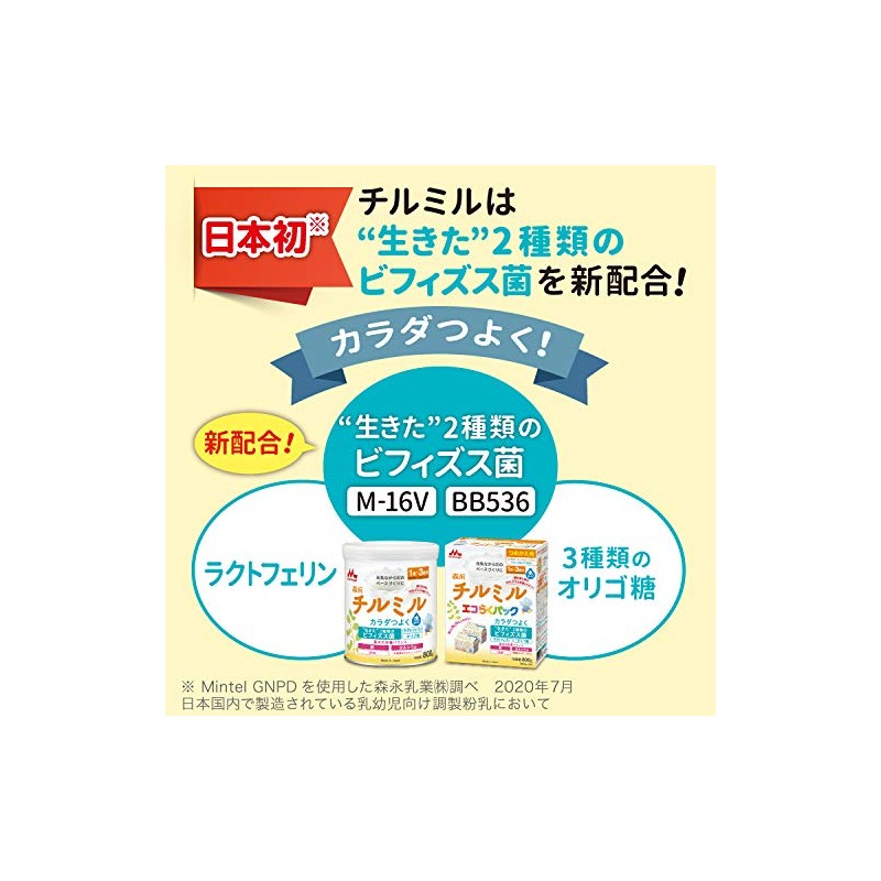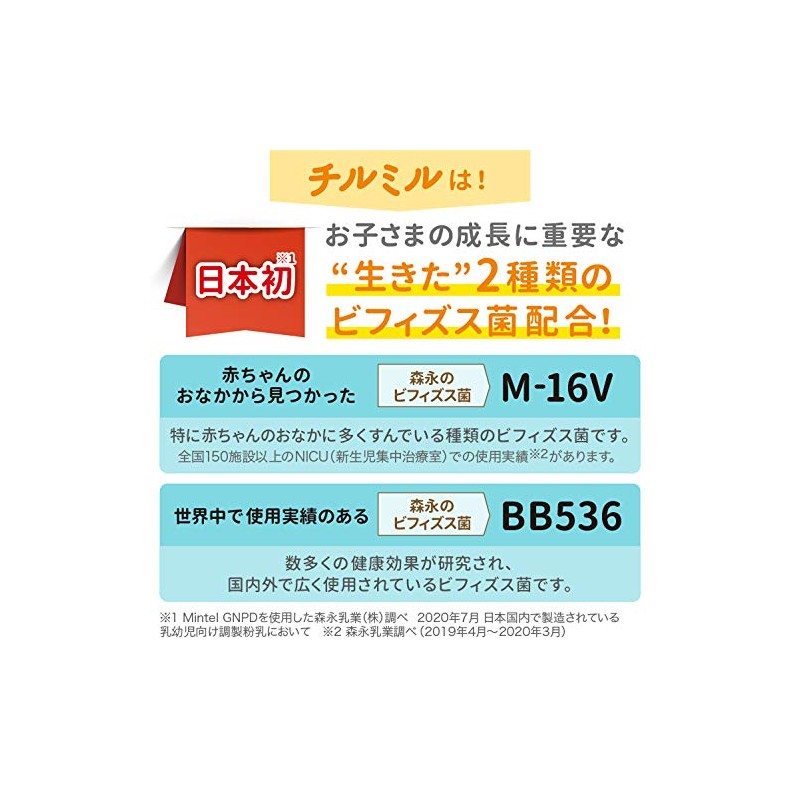 - 【ビフィズス菌配合】2種類のビフィズス菌(BB536・M-16V)を配合。ビフィズス菌M-16Vは全国150施設以上のNICU(新生児集中治療室)での使用実績があります。※森永乳業調べ(2019年4月~2020年3月)
