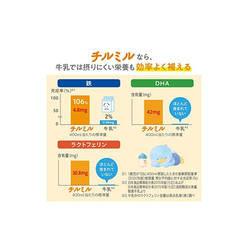- 【幼児期のお子さまに】1歳頃~3歳頃までのフォローアップミルク チルミル(満9ヶ月頃からでもご使用いただけます。離乳食が3回食になった頃からを目安としてください)。チルミルは、幼児期のお子さまに大切な栄養をバランスよく配合しています。