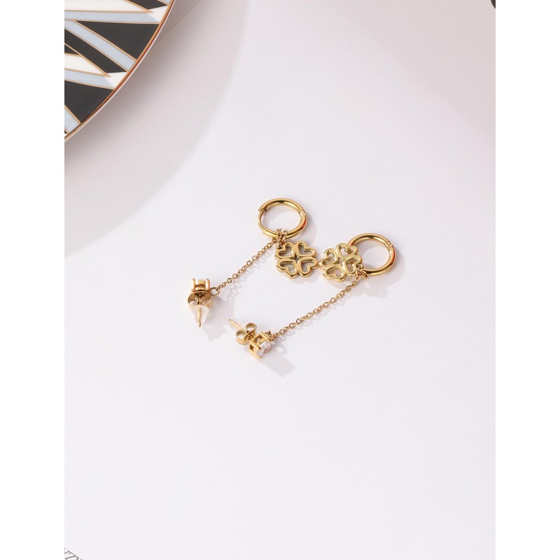 - Four-Leaf Clover Earrings – Wear Luck & Elegance:Luck, love, and elegance come together in these stunning four-leaf clover earrings. Featuring a sparkling zirconia stud connected to a delicate chain with a four-leaf clover charm, they add a touch of fortune and sophistication to any look. Made from hypoallergenic 316L surgical steel, these earrings are safe for sensitive ears and perfect for any occasion.
