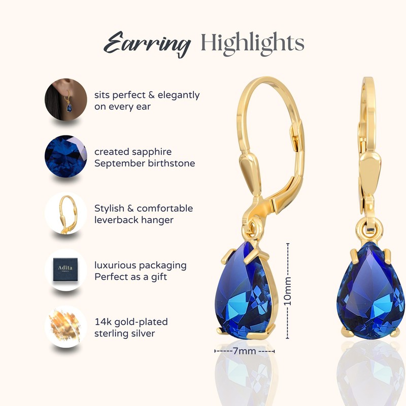 - Exceptional Quality: Made from 14K gold plated over 925 silver, these 14k gold dangle earrings features (7x10mm) Sapphire gemstone. High quality of gold leverback earrings for women craftsmanship ensures a durability and elegance.