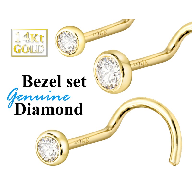 Choice of ONE PIECE 14Kt Yellow Gold or White Gold 22G Nose Screw Stud Nose Ring with Round Brilliant Cut Diamond in Bezel Setting. April Birthstone Nose Ring.
