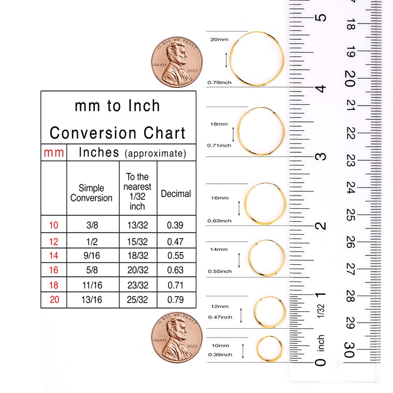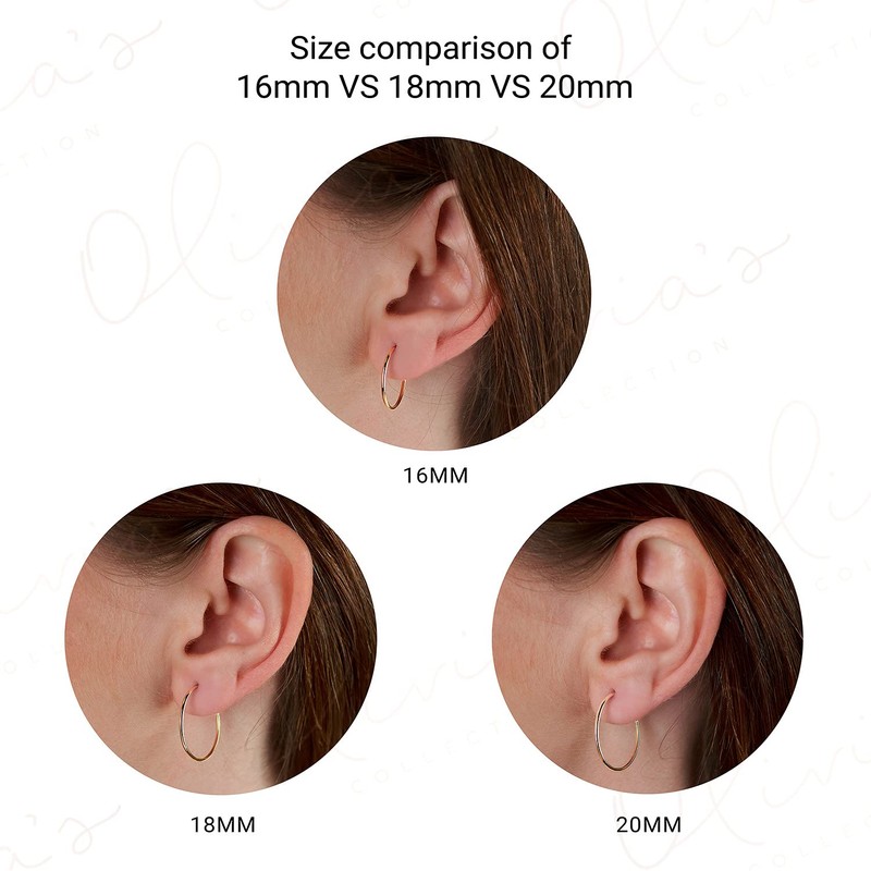 - Hoop Size. Large 18.0mm (0.71”) outer size & 16.0mm (0.63”) inner size. The width of the endless hoop earrings is 1.0mm (1/32”).