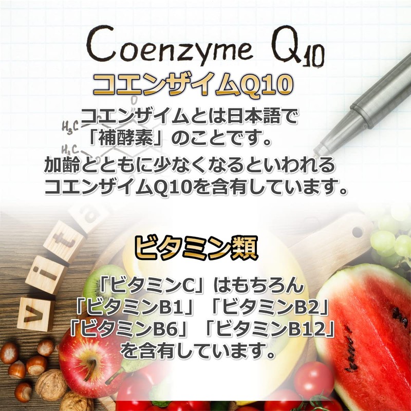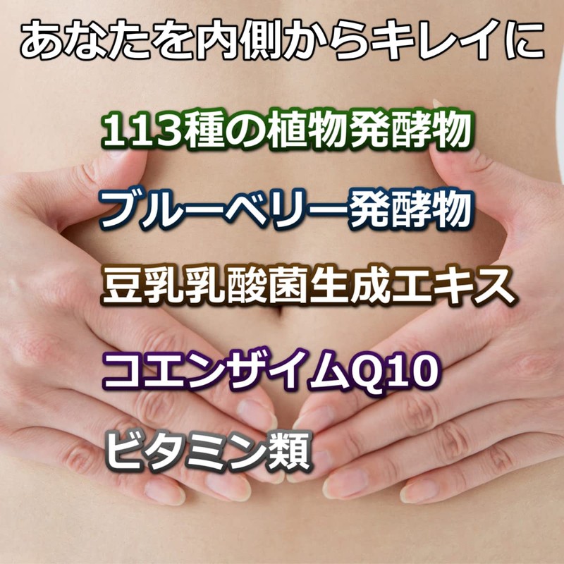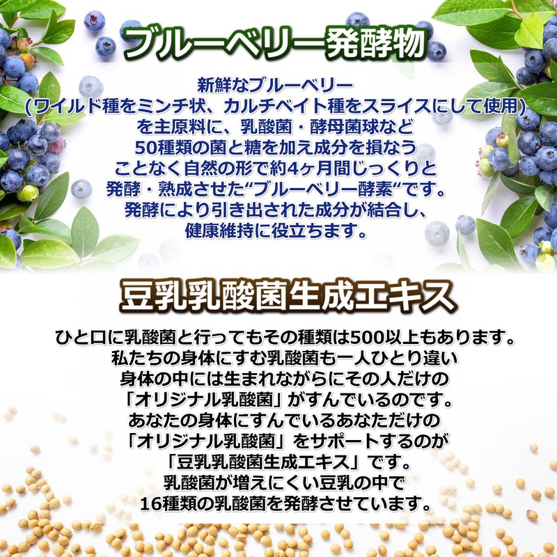 「113種類の素材を発酵熟成させた植物発酵物」と「ブルーベリー発酵物」「豆乳乳酸菌生成エキス」「コエンザイムQ10」を加えています。