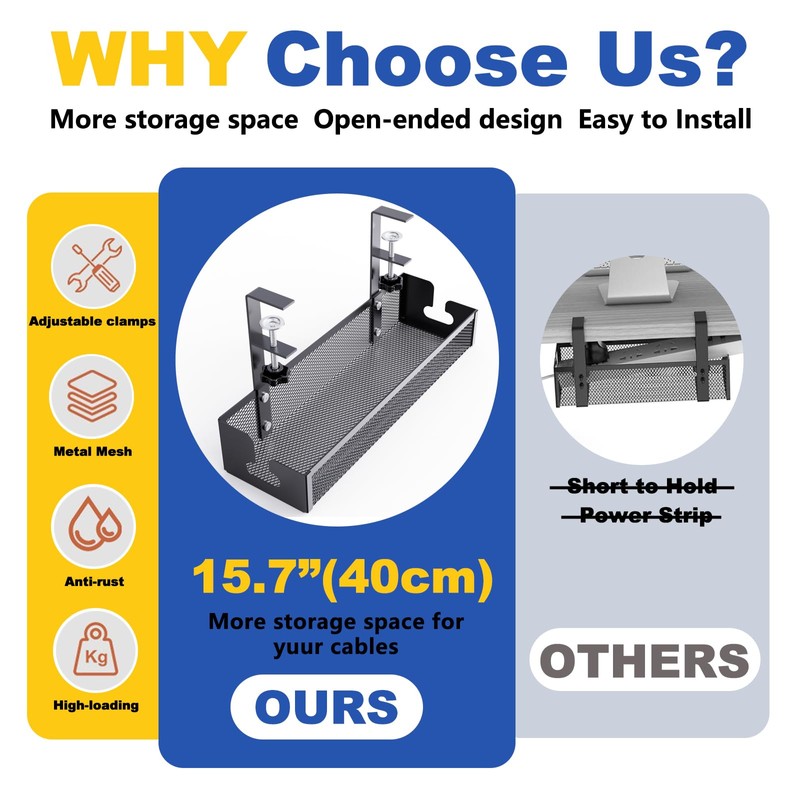 - UPDATED EXTENSIONS CLAMPS : Upgraded desk cable tray:15.7 in x 4.72 in x 7.08 in(40*12*18 cm),with longer clamp space - 8 in(20 cm),With EVA foam cotton, can effectively prevent the desktop from being scratched better weight balance and no slipping off