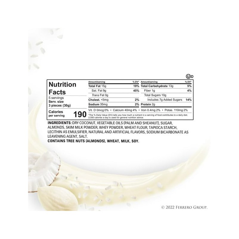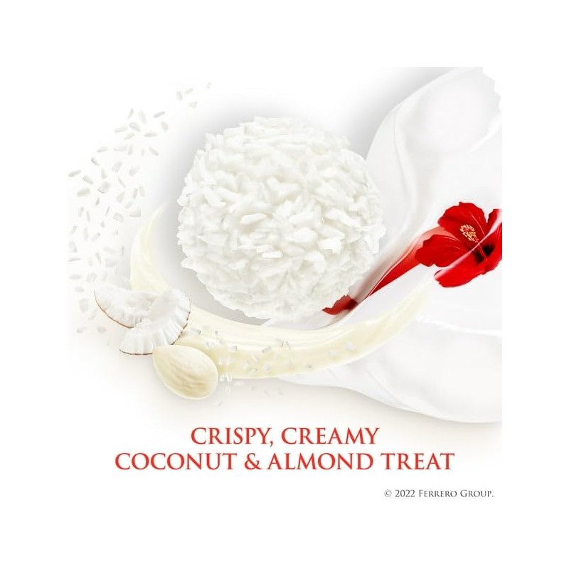 - COCONUT, MILK CREAM and WHITE ALMOND: A precious heart of white almond enveloped in a deliciously creamy filling, all enclosed in a crispy wafer shell and covered with fragrant coconut flakes