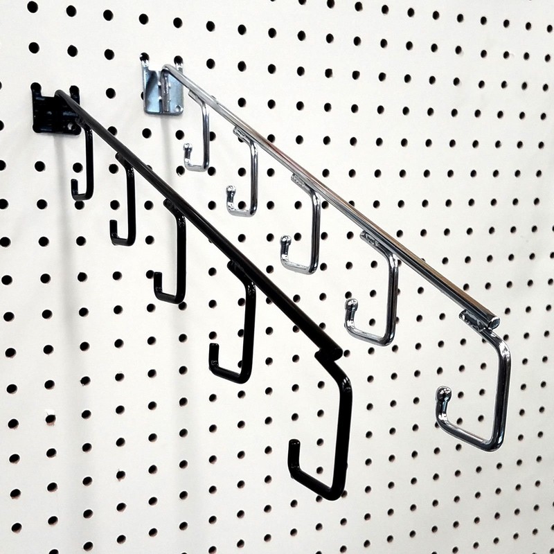 - Our pegboard 5 J-Hook waterfall store fixture has 5 hooks to hold items. It measures 15" L and fits 1/4" peg board holes.