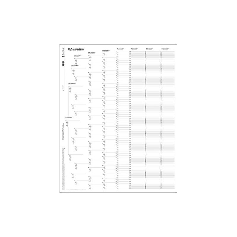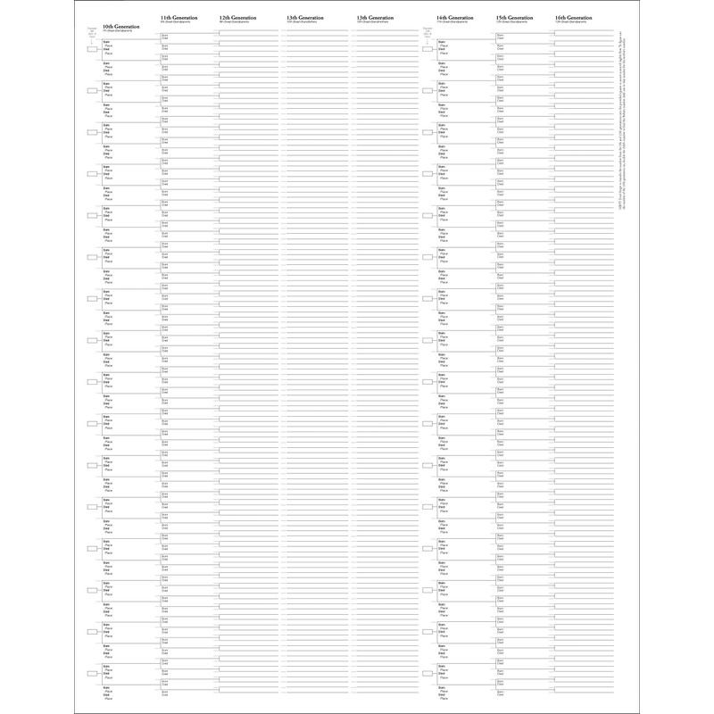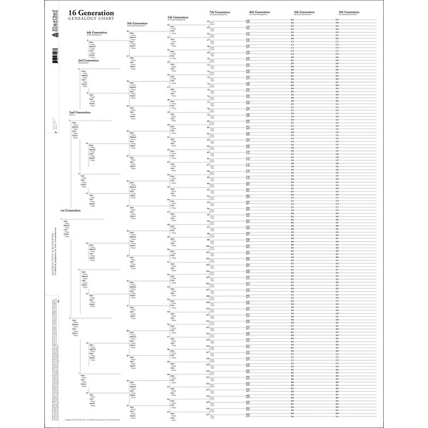 This 29" x 23" chart has room for a full 9 generations of names on the front (with space for birth date & place, marriage date & place, death date & place, and burial place) for the 1st through the 5th generations, with only birth & death information for generations #6 through #9. On the back are spaces for birth & death information for the 10th through 16th generations with room for names only for generations 12, 15 and 16. This chart comes folded and pre-punched for a 3-ring binder. Printed on acid free 80lb text paper.