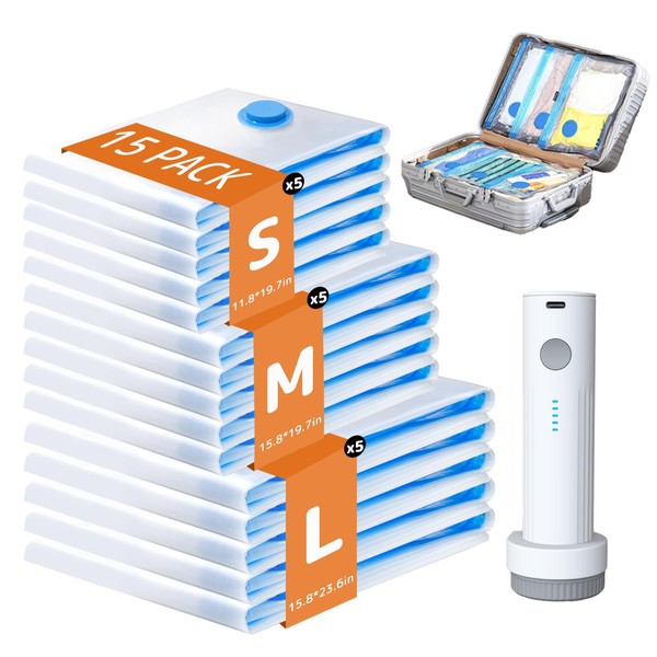 - Designed For Travel: Includes 15 vacuum bags in 3 sizes (11.8×19.7in, 15.8×19.7in, 15.8×23.6in) to suit every need - perfect for backpackers, students, or families needing extra suitcase space