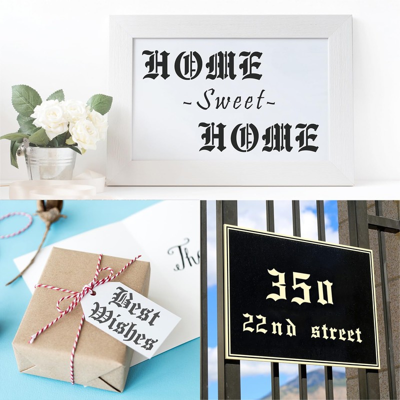 • 🎨Easy to Use: The letter and number patterns are aligned accurately for better effects. Can be applied with pens, sponge brushes, painting brushes, acrylic paints, air spraying, graffiti spray cans, etc. The old English stencils are simple operation, you can create DIY projects and enjoy DIY fun.