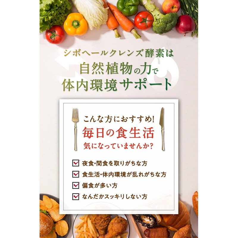 - 「 シボヘール クレンズ 酵素 」は、 夜 の時間と 体内環境 に着目したダイエッターサポート (※1) サプリメント です。生きた 植物 酵素 (※2) と ハーブ ファイバーをベースに、ダイエッター の強い味方“ L-カルニチン ・ α‐リポ酸 ・生きて腸まで届く 乳酸菌 ”を配合。 寝ている時間も有効活用して、 体内環境 をしっかりサポートします。 (※1 ダイエット する方の栄養補給 ※2 酵素 活性のある原料を配合しているという意味)