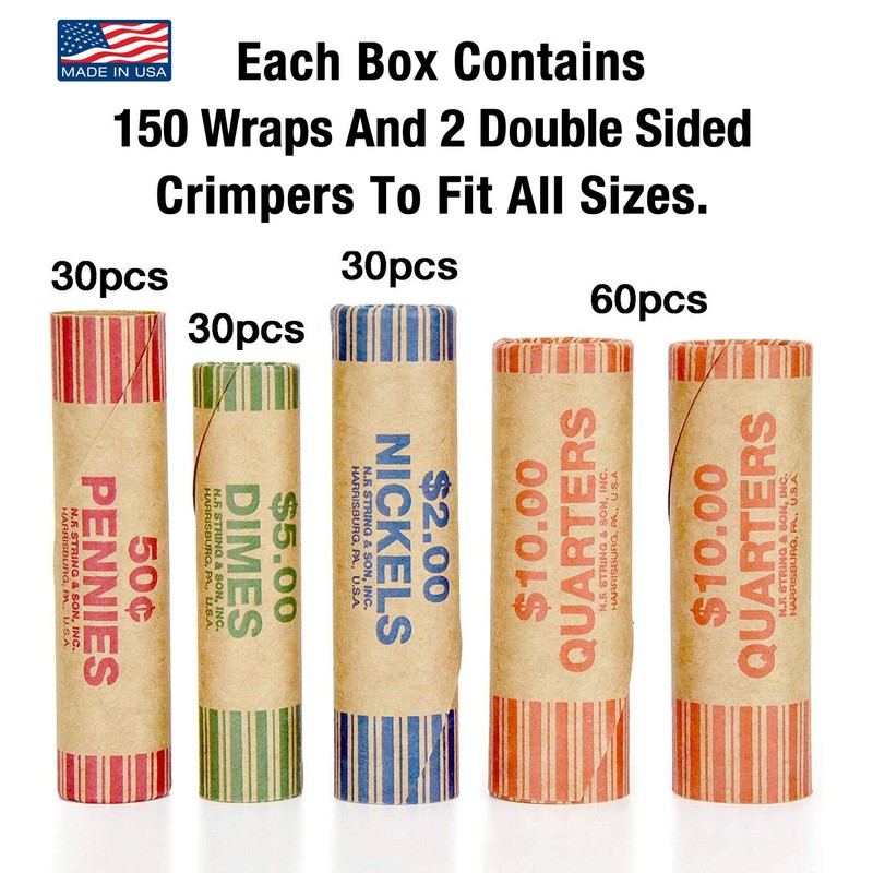 - All you need in one bundle - Each set contains 150 coin rolls wrappers (30 pennies, 30 dimes, 30 nickels and 60 quarters) + 2 double sided crimpers (with all 4 options of the coin wrappers in the set).