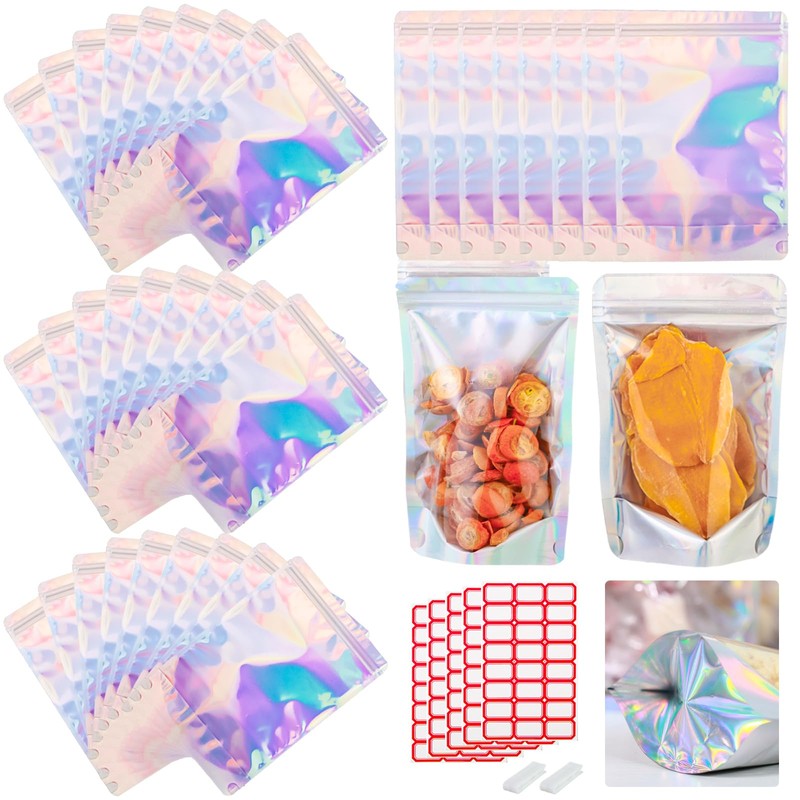 - Super-value Packs: You will receive 150 pieces of 7 x 10 inches 1 Quart holographic stand up mylar bags, 5 sheets of label stickers and two sealing clips. Offering an abundance of options for various food items applications and portable design for on-the-go convenience.