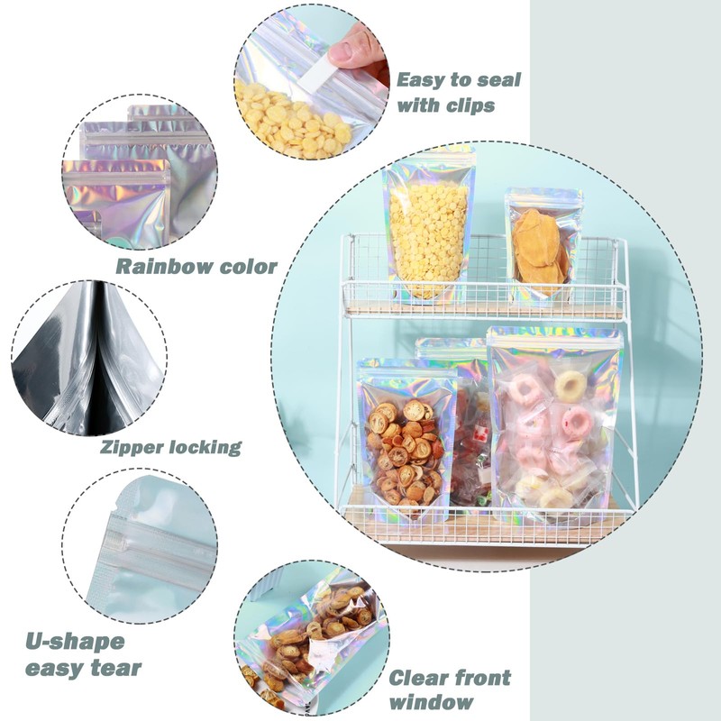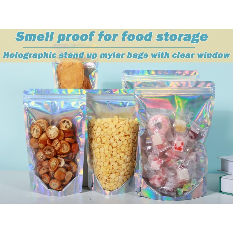- Clear Window & See through: Designed with holographic in the back and transparent in the front of these edible packaging mylar bags, which offers convenience to identify the contents without having to open them. Whether storing snacks, jewelries, or other items, the clear window ensures quick and effortless organization.