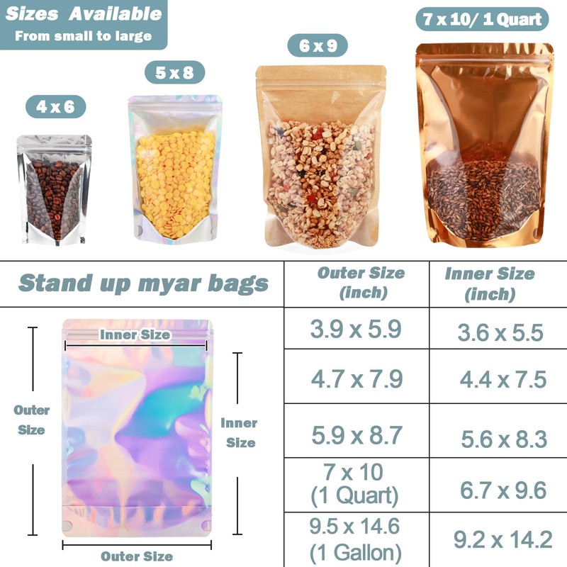 - Versatile Usage: Multiple colors of gold, silver, holographic and kraft paper, various sizes from 3.9” x 5.9”, 4.7” x 7.9”, 5.9” x 8.7” and 7” x 10” to suit your specific needs, ranging from small to large capacities. These large quart stand up mylar bags are perfect for organizing nuts, snacks, grains, biscuits, candies, teas, coffee beans, jewelries, cosmetics, electronic accessories, decorative gadgets and many more items. Excellent solution packaging way to help grow your small business.