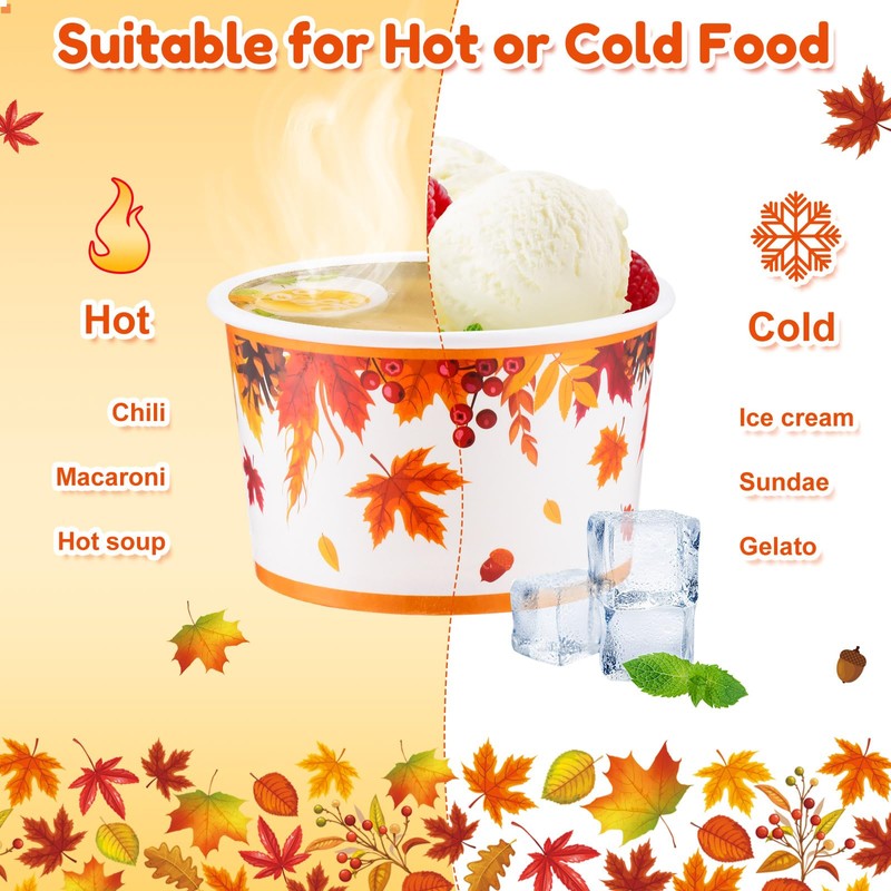 - Fall Maple Leaf Theme: the disposable ice cream cups are designed with 3 different autumn maple leaf patterns, which is a good addition to any happy fall party supplies; The ice cream cups can add vibrant atmosphere and give an impression to your guests