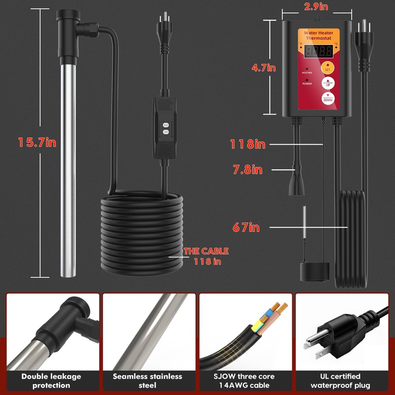 - MULTIPLE SECURITY PROTECTION - The electric fully submersible water heater with advanced GFCI (Ground Fault Circuit Breaker). ETL certified with overload protection, overheat protection and explosion protection. Reduces the risk of electric shock and fire. The electric fully submersible water heater use high quality insulated cables. Can effectively prevent short circuit and corrosion. Fully waterproof design combined with seal welding. Effectively avoid electrical safety hazard.