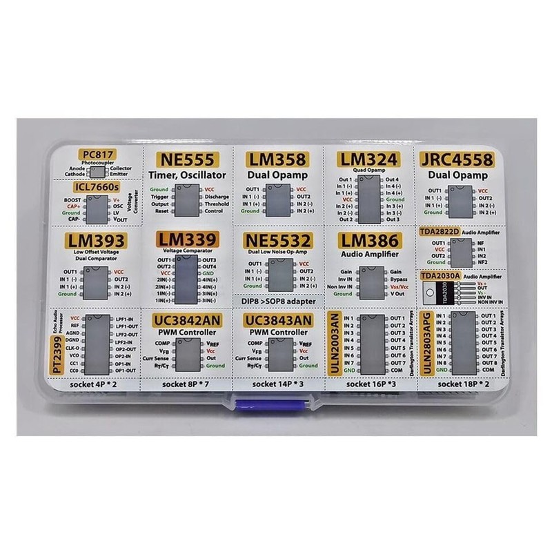 Adapter for Easy Conversion: Included in the assortment is a DIP-8 to SOP-8 Through-Hole to SMD Converter Adapter, allowing for seamless integration of SOP-8 ICs into through-hole circuit boards, expanding the versatility of the IC assortment.