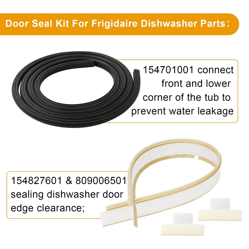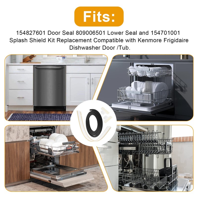 - For Dishwasher Door Seal:dishwasher seal kit,154827601 door seal, 809006501 lower seal, and 154701001 splash shield kit replacement; 154827601 809006501 seals for dishwasher door edge clearance,154701001 connecting the front and lower corners of the bucket, To prevent the dishwasher from leaking while working