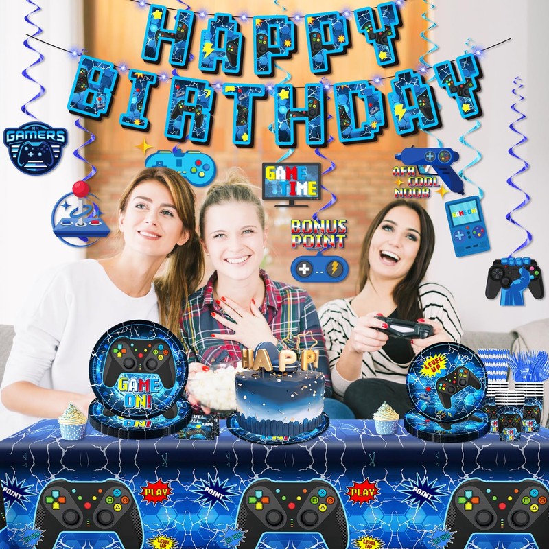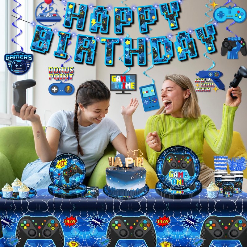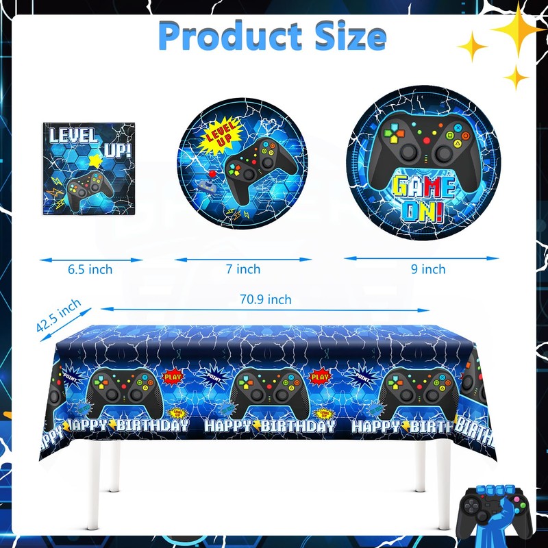 • Package Includes: You will receive 169 pieces of gamer birthday party decorations in this gaming birthday decoration set, including 1 x video game birthday banner with 118.2 inch blue string lights,8 x video game card, 8 x hanging swirls, 1 x video game tablecloth 70.9 x 42.3 inch, a tableware set for 25 guests including forks, straws, 7 inch dessert plates, 9 inch dinner plates, napkins and cups,these game birthday decorations are enough to satisfy your kids and family