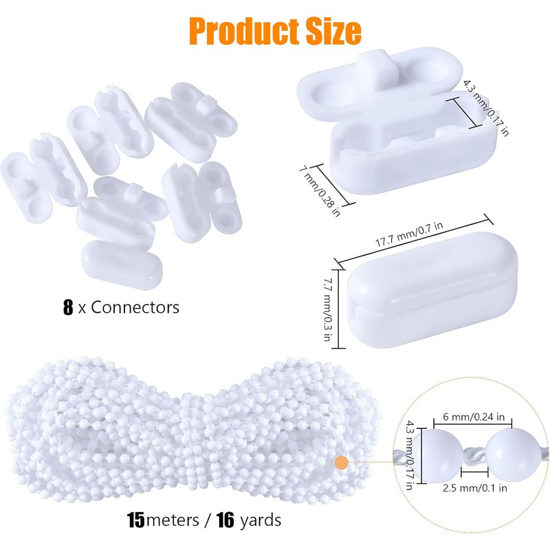 • ✅ Extended Length & Value: 15 meters (16 yards) of continuous chain + 8 connectors (20% more than competitors)! Bead diameter 0.17in/4.2mm, spacing 2.5mm. Perfect for large windows, outdoor blinds, or multi-panel setups.