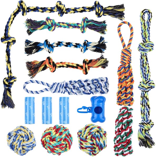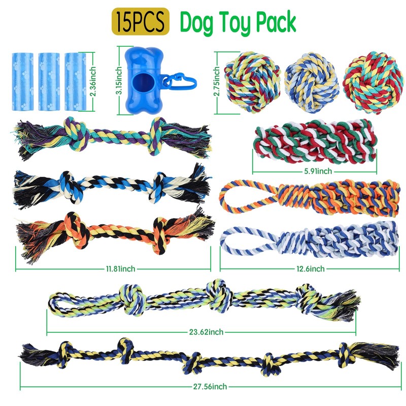 - Great value 15 pieces of dog toys:The package includes 8 pieces of durable rope toys for dog chewing, tug of war, and teeth cleaning, and 3 pieces of colorful cotton balls for dog training and play. The ropes are perfectly sized for a comfortable grip and provide hours of fun for your dog, and the package also includes 4 pieces of dog supplies.