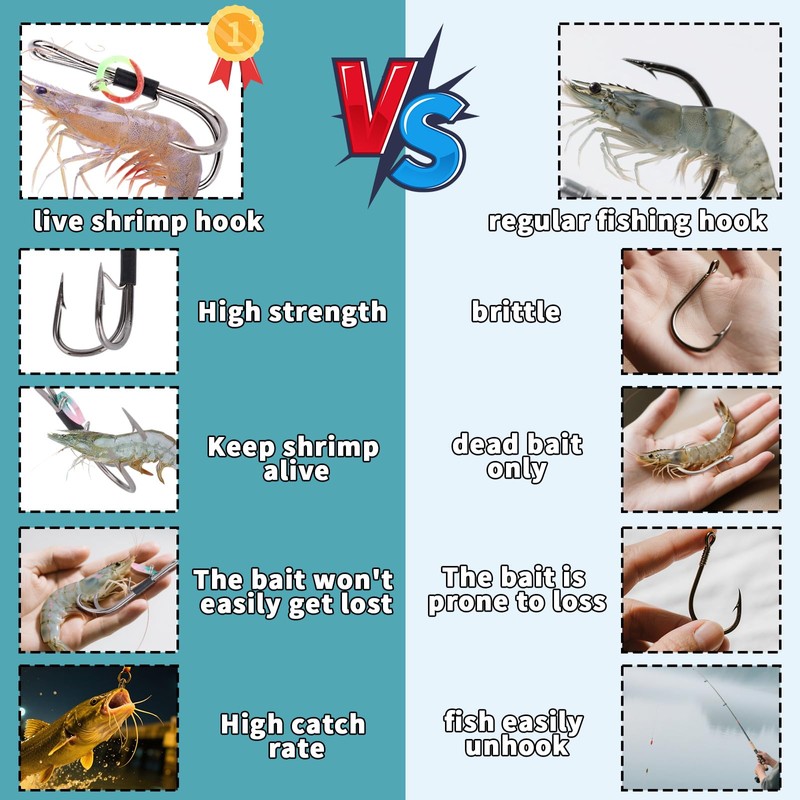 - Praktisches Design: Dieser Live-Garnelenhaken nimmt ein neuartiges Y-förmiges Doppelhaken-Design an, mit dem Sie eine höhere Fangrate erzielen können, und die gebogenen und scharfen Haken haben eine gute Penetrationskraft und ziehen gleichzeitig große lebende Shrimps oder Fische an.