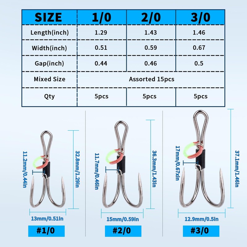 - Lieferumfang: Sie erhalten 15 Doppelhaken in 3 Größen zur Auswahl. Praktische Funktionen und eine ausreichende Menge erfüllen Ihre Angelbedürfnisse und erleichtern das Fischen. HINWEIS: Dieses Produkt wird nicht an Personen unter 18 Jahren verkauft.