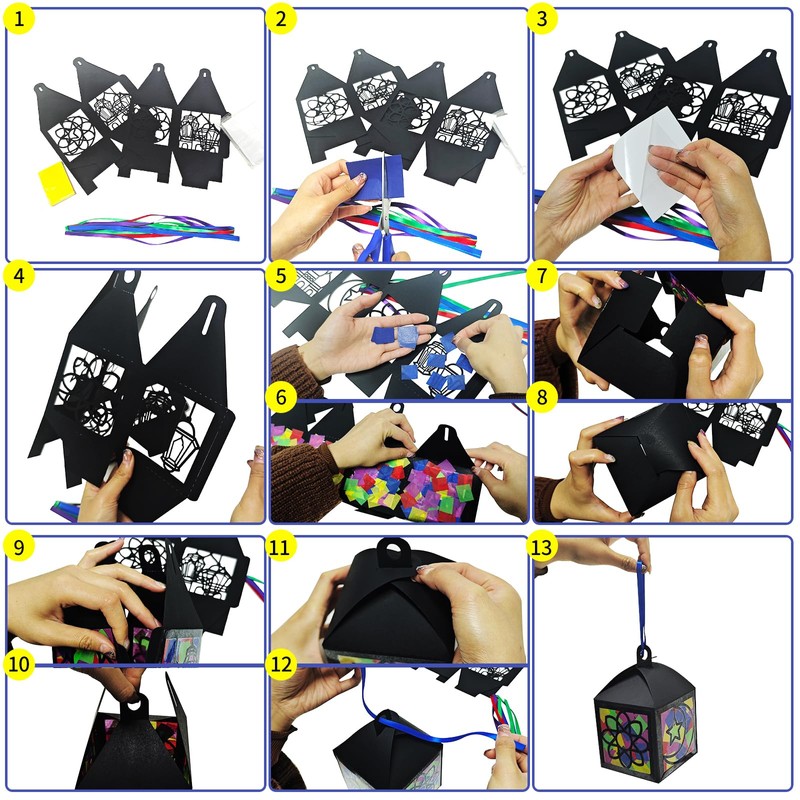- 🎨 Simple and Fun to Assemble: Creating your Ramadan decorations has never been easier! Simply insert the colorful glass paper into the lantern shapes, attach the included ribbon, and hang them near a light source. You'll enjoy the beautiful stained-glass effect as sunlight pours through the translucent paper.