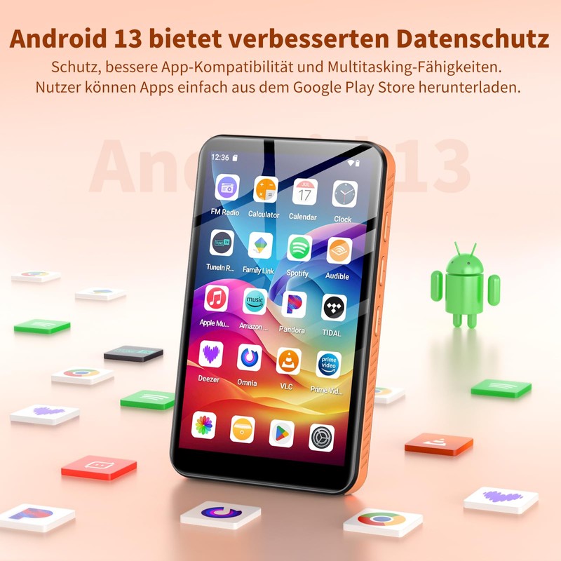 - Android 13 MP3 music player: The Android MP3 player with Android 13 OS and MTK 8-core processor provides a seamless user experience, access to a large collection of apps, a much better experience in personalising the interface, control performance and battery life. Pre-installed with many of the most popular online music apps, including Spotify, Omnia, Deezer, Amazon Music, Play Store, FM Radio, etc.