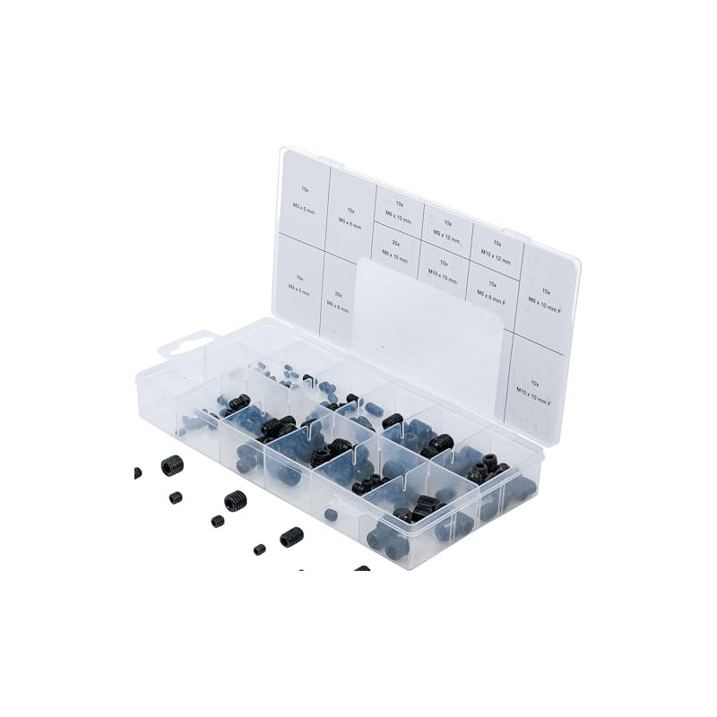• Grub screws with standard thread: 15 grub screws M3 x 5 mm | 15 grub screws M4 x 5 mm | 20 grub screws M6 x 6 mm | 10 grub screws M6 x 10 mm | 20 grub screws M8 x 10 mm | 10 grub screws M5 x 6 mm | 10 grub screws M8 x 12 mm | 10 grub screws M10 x 10 mm | 10 grub screws M10 x 12 mm