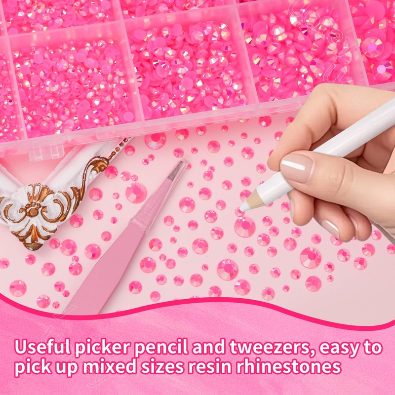 • Package Content: The jelly rhinestones kit includes 1 box with 15 grids, featuring a variety of colors choice, approx 16000 pcs multi zise bling resin jelly rhinestones (Hot Pink). 1 tweezers and 1 pickup pen are included for easily picking up of rhinestones. The large amount will support you to fulfill a number of your wonderful DIY decoration ideas