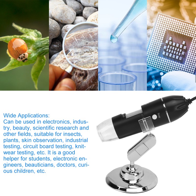 1、1600X Magnification: 1920 x 1440, 640 x 480 resolution, you will observe a high resolution, bright image. Fine antiskid focusing pattern, accurate positioning, 50X‑1600X adjustable magnification according to the observed object. 360 degrees horizontal rotation, 90 degrees vertical rotation, easy to adjust the viewing angle. 2、8 Adjustable LED Light: 8 LED lights provide excellent detail and optimal clarity. You can adjust the brightness and color temperature of the light according to different scenes. 3、USB Microscope: USB interface, equipped with USB to type C adapter, suitable for Android mobile phones, laptops, compatible with mainstream operating systems. 4、Taking Photo Or Video: You can save the content you see under the digital microscope in the form of pictures or videos and share it with family and friends. The ability to take video and still photos is amazing. 5、Wide Applications: Can be used in electronics, industry, beauty, scientific research and other fields, suitable for insects, plants, skin observation, industrial testing, circuit board testing, knitwear testing, etc. It is a good helper for students, electronic engineers, beauticians, doctors, curious children, etc.
