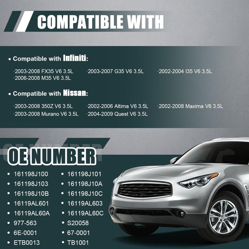 - Compatible Vehicle Models and Years:For 2003-2008 Infiniti FX35 V6 3.5L, 2003-2007 G35 V6 3.5L, 2002-2004 I35 V6 3.5L, 2006-2008 M35 V6 3.5L; for 2002-2006 Nissan Altima V6 3.5L, 2002-2008 Mazda V6 3.5L, 2003-2007 Loulan V6 3.5L, 2004-2009 Quest V6 3.5L, 2003-2006 350Z V6 3.5L, 2007-2008 350Z V6 3.5L, 2003-2004 Patricia V6 3.5L. Please check vehicle fitment to ensure you get the correct product for your vehicle.
