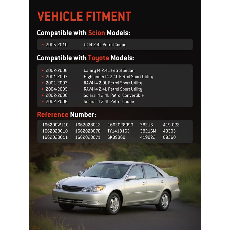 - Vehicle Fitment: Compatible with Toyota 2002-2005 Camry, 2006 Camry (ACV30, To 2/06), L4 2.4L, 2001-2007 Highlander L4 2.4L, 2001-2002 RAV4 L4 2.0L, 2004-2005 RAV4 L4 2.4L, 2002-2005 Solara, 2006 Solara (To 4/06), L4 2.4L; Compatible with Scion 2005-2009 tC L4 2.4L