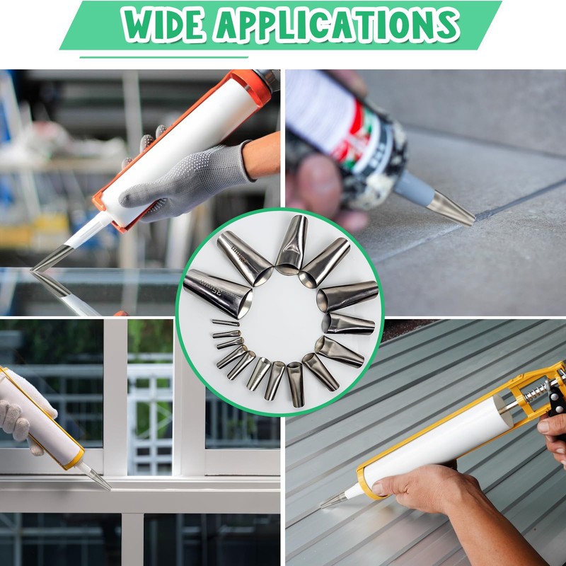 - 【Packaging Includes】This package contains 16 different sizes of Stainless Steel Caulking Nozzle Set: 5, 6, 7, 9, 10, 12, 13, 16, 18, 20, 23, 25, 26, 28, 30, 35mm. Multiple sizes of Caulking Nozzle Applicator Kit can meet your caulking needs in a variety of scenarios, making your repair job easier!