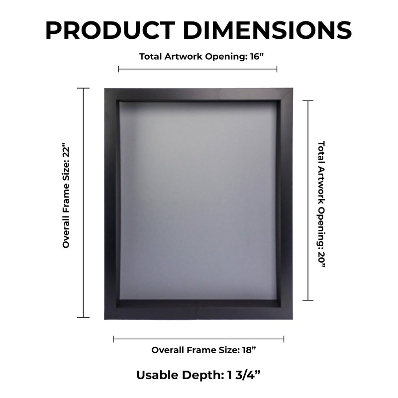 - Usable depth is 1 3/4 inches. Overall frame size is 18x22 inches.