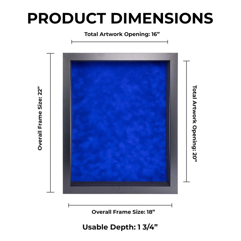 16x20 Shadow Box Frame Black Wood with a 1 3/4" Usable Display Depth Includes a Royal Blue Suede Acid-Free Backing Board, UV Resistant Acrylic, and Hanging Hardware