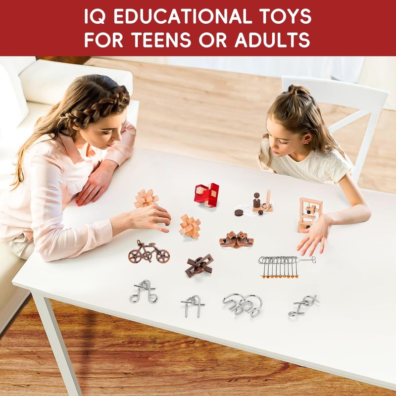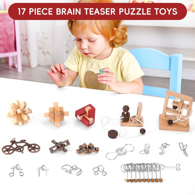 - 【Quality Material】The mind brain IQ logic puzzle are made of quality wood and stainless steel, safe and reliable, with smooth and rounded corners, which are not easy to break or bend.These puzzles are built to last, without peaked or cutting edges.This package comes with 17 pieces 3D brain teaser puzzles, each with their own distinct challenges and design.