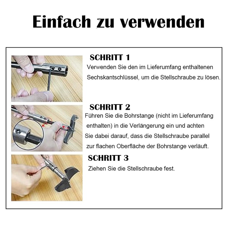 Convenient to use: the use process is quick and easy, without complicated steps. First, use the included hex wrench to loosen the set screw, then insert the drill rod (not included) into the extension rod and make sure the set screw runs parallel to the flat surface of the drill rod, and finally tighten the screw.