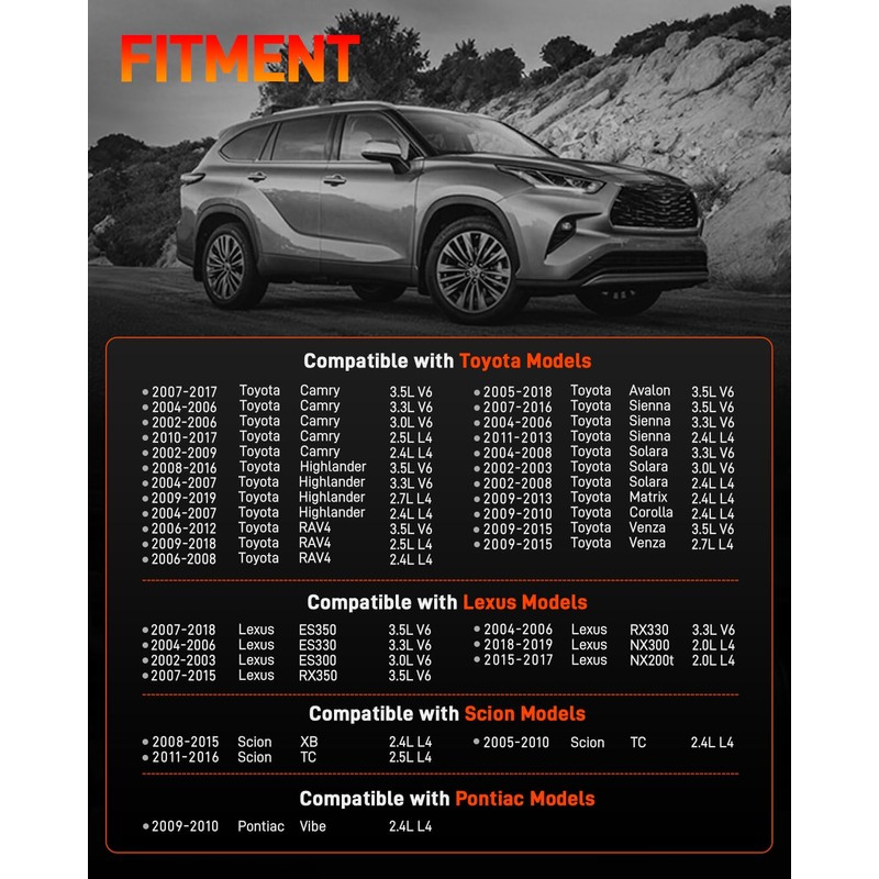 - Fitment: Compatible with Toyota Camry Highlander, RAV4, Avalon, Corolla, Matrix, Sienna, Solara, Venza; Lexus RX330, RX350, ES330, ES350, NX200t; Scion XB, TC; Pontiac Vibe. Please refer to the pictures for detailed models before purchasing