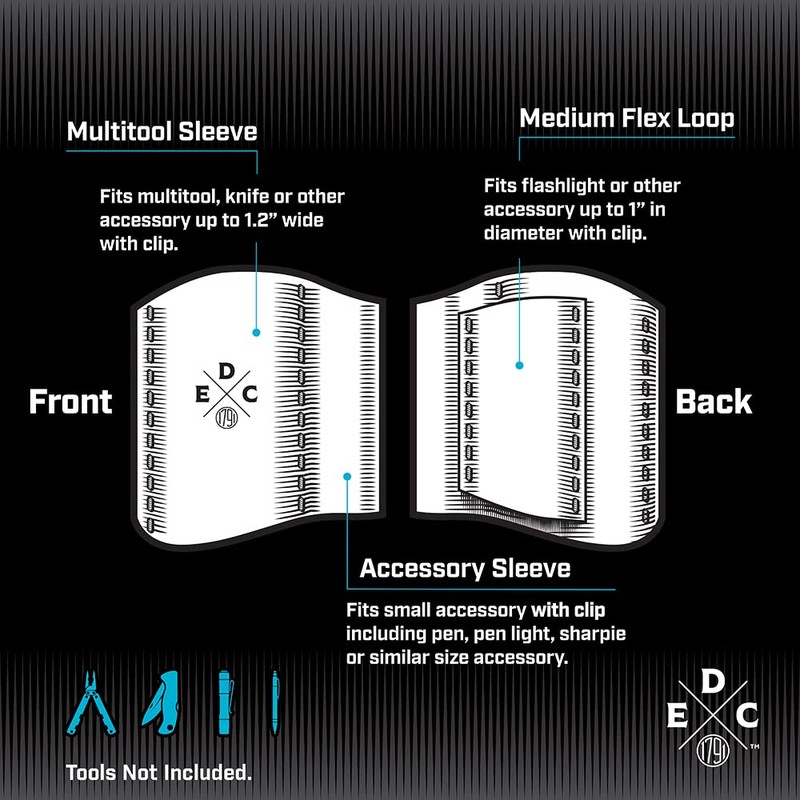 - [ Medium Flex Loop ] Fits accessories up to 1.0" wide with clips including small flashlights, pocket sized multitools and minature EDC folding knives from Civivi, WE Knife and CRKT or similar size accessories.