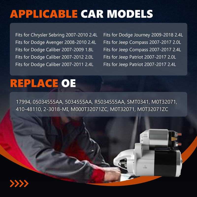 The starter motor compatible with Journey 2009-2018 2.4L L4, Patriot 2007-2017 2.0L 2.4L L4, Compass 2007-2017 2.0L 2.4L L4, Caliber 2007-2009 1.8L L4& 2007-2012 2.0L L4& 2007-2011 2.4L L4, Sebring 2007-2010 2.4L L4, Avenger 2008-2010 2.4L L4. Replacement Part Numbers is 17994, 17994N, 5034555AA, 05034555AA, R5034555AA, M0T32071, M0T32071ZC, M000T32071ZC, SMT0341, 410-48110, 2-3018-MI.