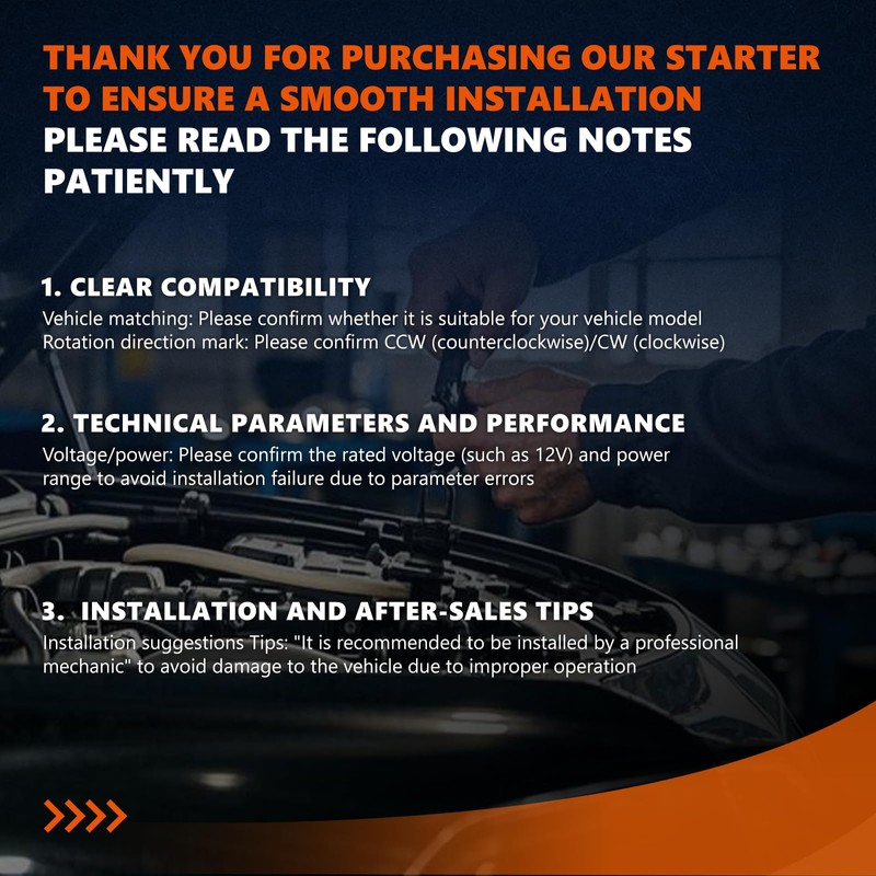- 【Parameters】Car starter 1.2kW 12V Clockwise 8 Teeth. Features heavy-duty construction with pure copper windings, hardened steel gears, and robust bearings. Advanced corrosion protection resists road salt and moisture damage for sustained performance. Strict QC & Fitment Tested before shipment. One Year Warranty.