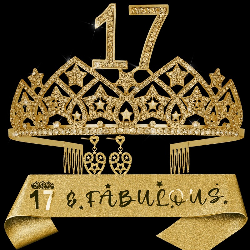 - 17th Birthday Decorations for Girls: Best 17th Birthday Present for 17th Birthday Girls to celebrate her 17 Birthday. This 17th Birthday Gifts for Girls contain a Stunning 17th Birthday Gold Crown, Golden 17 Birthday Sash, a pair of Gold 17 Birthday Earrings. Our 17 Birthday Favors is perfectly for 17th Birthday Girls, 17 Years Old Daughter, 17 Birthday Gifts for Teen Girls, 17th Birthday for Her, 17 Birthday for Girls, 17th Birthday Gifts for Sister