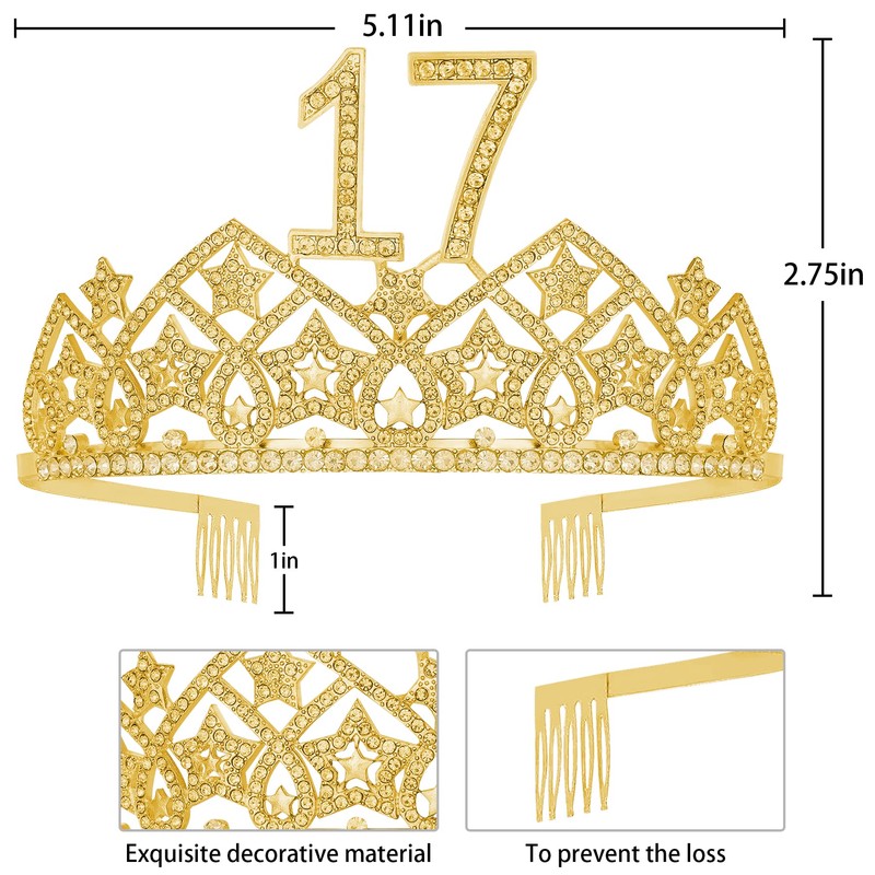 - 17th Birthday Gifts for Girls: 17 Year Old Birthday Gifts set contains a Stunning Golden 17th Birthday Crowns matches with 17 Birthday Golden Sash and 17th Birthday Gold Earrings. Our 17 Birthday Tiara with unique designed and made of high quality of alloy and rhinestone that makes Golden 17 Birthday Crown very durable and long lasting. Surely 17 Birthday Tiara will make our 17th Birthday Queen stand out from the crowd