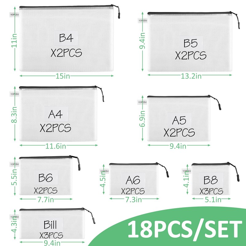 - What You Will Get: 18pcs zipper organizer bags. 2*B4 (14.9*11 inches), 2*A4 (13.1*9.4 inches), 2*B5 (11.6*8.2 inches), 2*A5 (9.4*6.8 inches), 2*B6 (7.6*5.5 inches), 2*A6 (7.2*4.5 inches), 3*Bills (9*4.3 inches), 3*B8 (5.1*4.5 inches),come with small colored stickers to mark the contents and help you easily keep track of the items inside