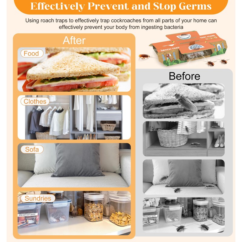 - Strongly Adhesive Roach Glue Traps: Roach killer indoor infestation catches by placing scented cockroach baits or other food on the roach traps indoor to attract cockroaches as well as other vermin to crawl on the cardboard, which is designed with upgraded glue. So cockroaches are effectively stuck by the strong glue traps.